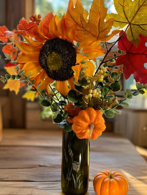 Hand etched recycled repurposed Re-Homed wine bottle flower vase